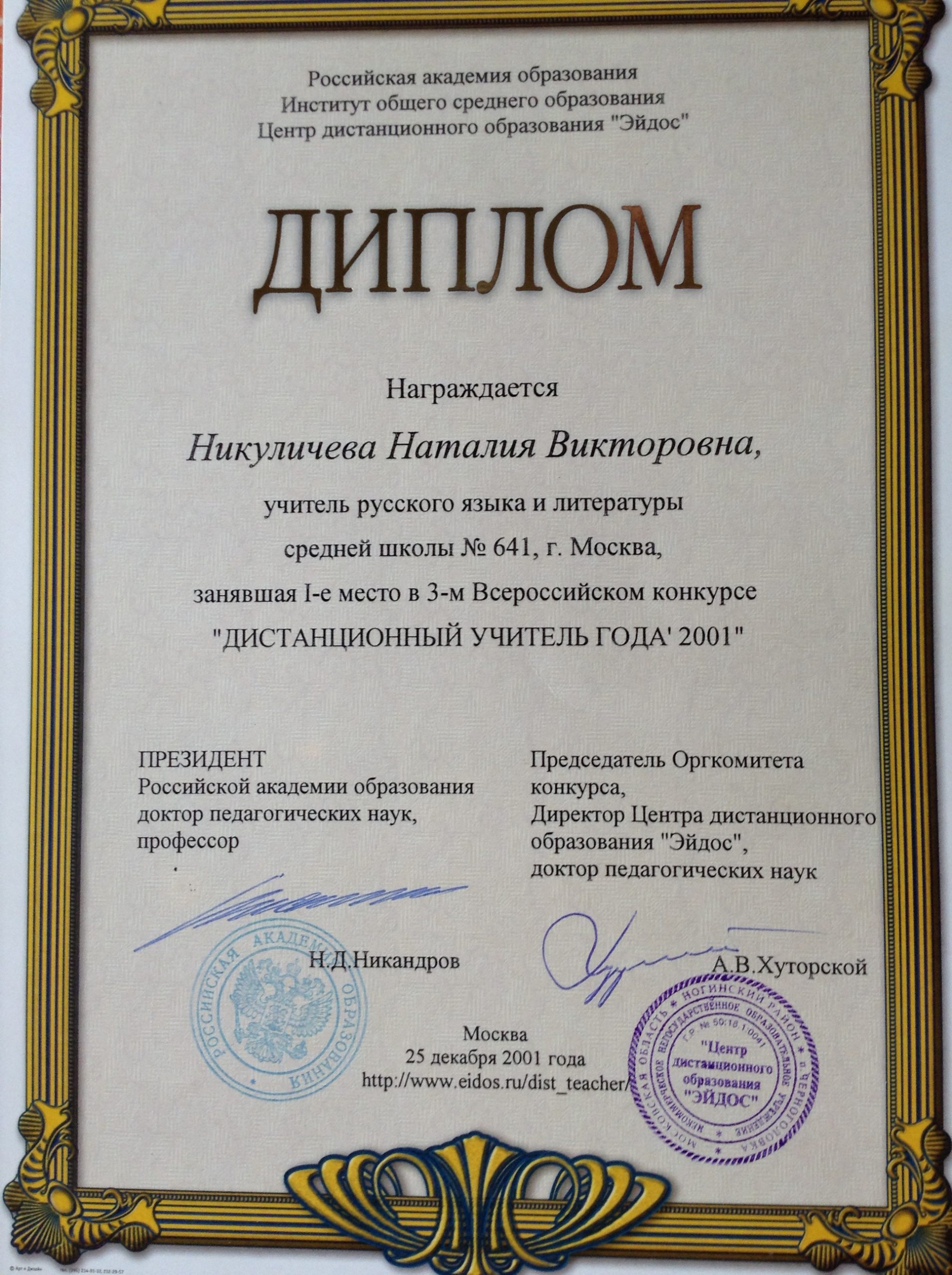 Победитель 3-его Всероссийского конкурса «Дистанционный учитель года 2001»